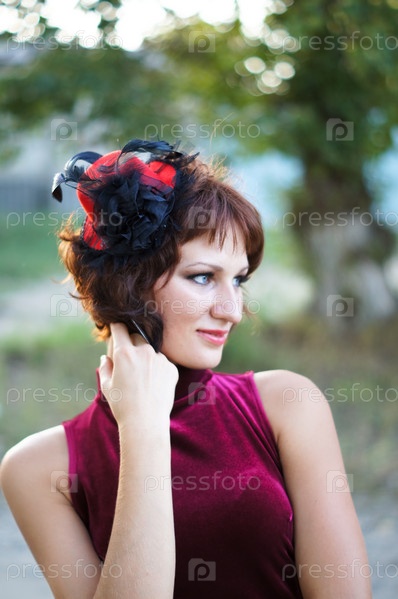 Девушка в вечернем красном платье на природе
