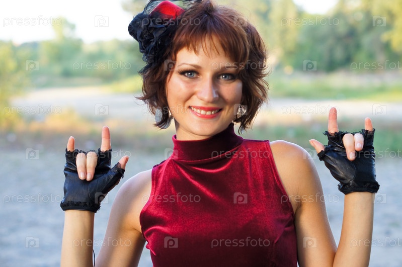 Девушка в вечернем красном платье на природе