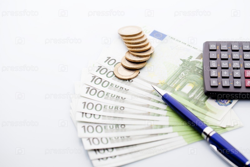 Банкноты, монеты, ручка и калькулятор на заднем плане, изолировано