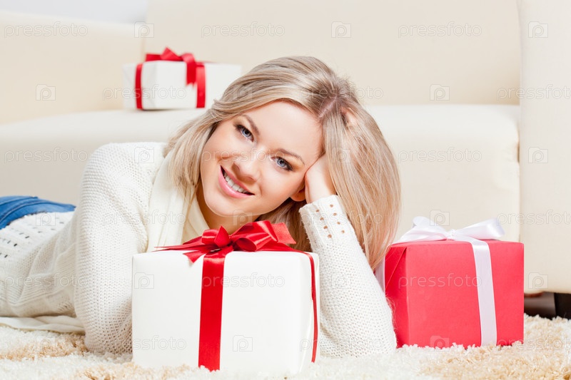 Счастливая женщина лежит на полу с подарками