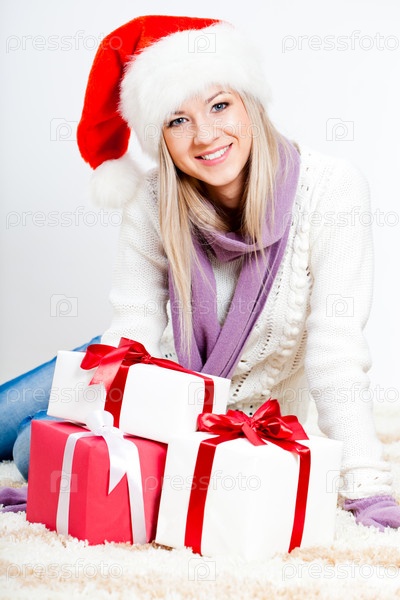 Женщина в колпаке Санты сидит на полу