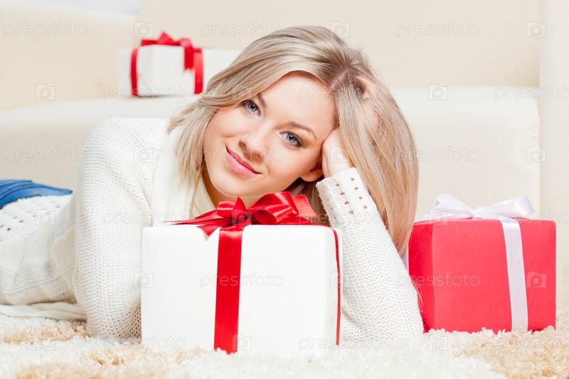 Счастливая женщина лежит на полу с подарками