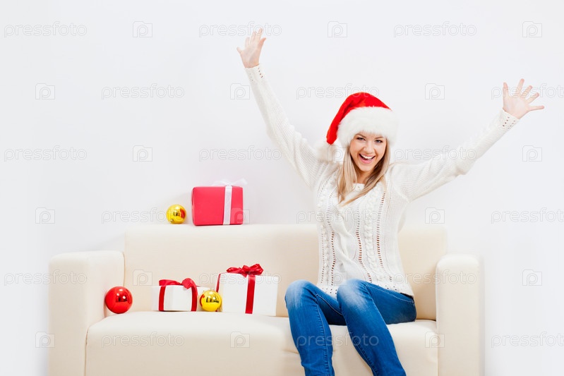 Счастливая женщина сидит на диване с подарками