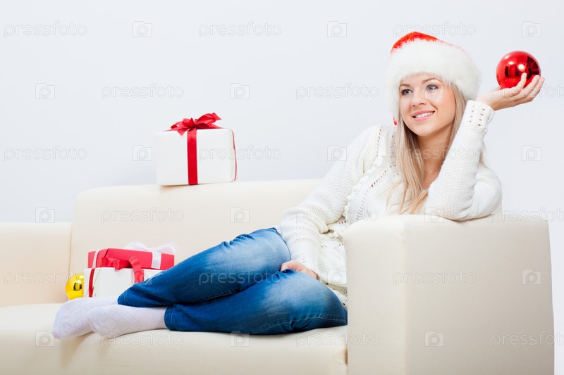 Женщина сидит на диване и держит рождественский подарок