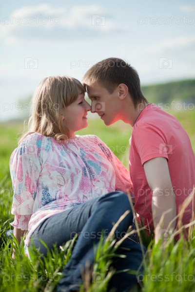 Счастливая пара лежит на траве