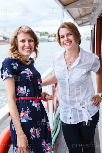 Счастливые привлекательные женщины стоят на палубе корабля в круизе