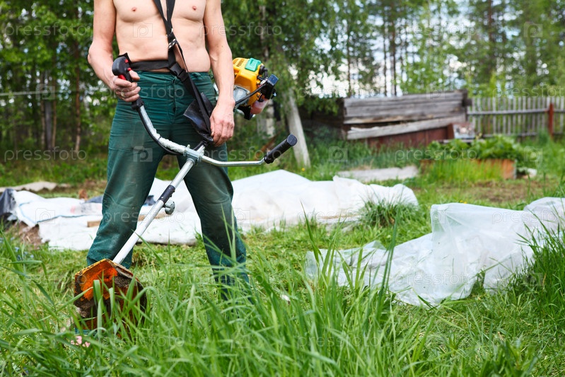 Мужчина с газонокосилкой