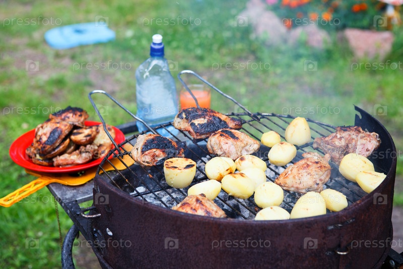 Жареное мясо и картофель на мангале