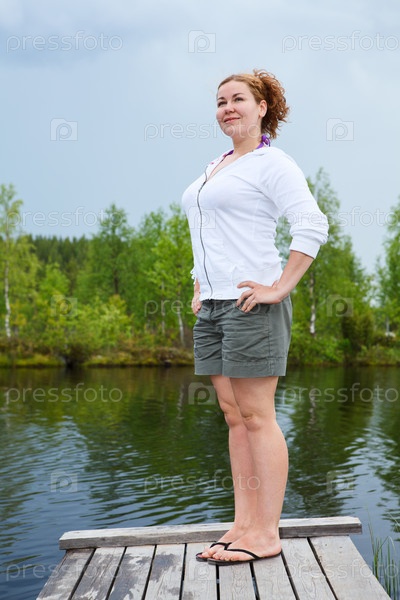 Женщина делает упражнения на деревянном мостике у озера