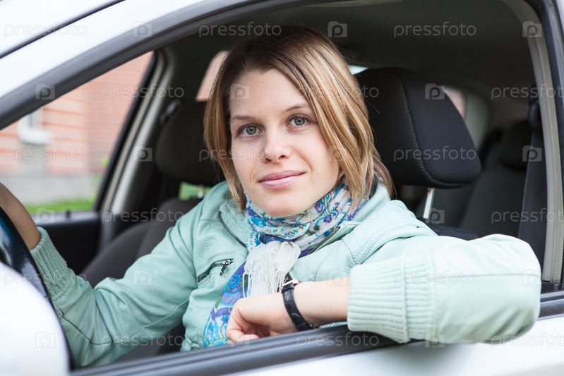 Счастливая женщина-водитель за рулем