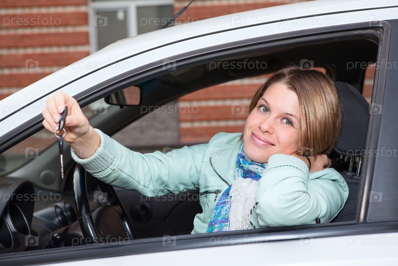 Ключ зажигания в руке девушки в автомобиле