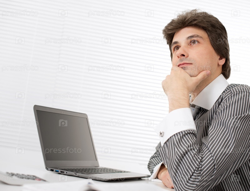 Молодой задумавшийся мужчина работает на ноутбуке