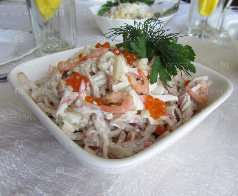 Вкусный салат с креветками и красной икрой, украшенный зеленью