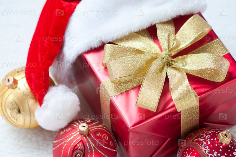 Красная подарочная коробка с золотым бантом и колпак Санты