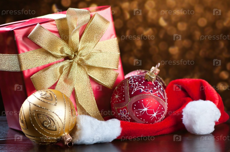 Рождественский подарок, новогодние шары и колпак Санты