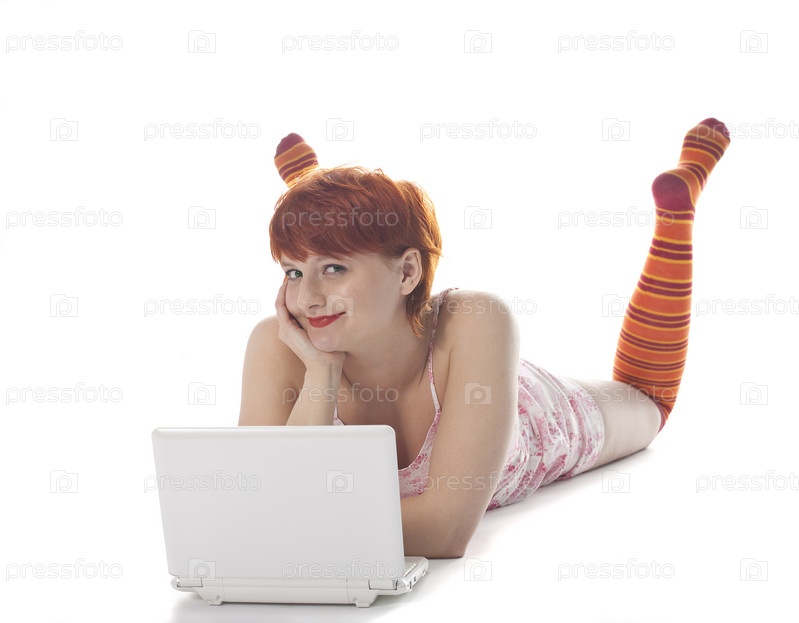 Красная девушка в полосатых носках с ноутбуком на белом фоне