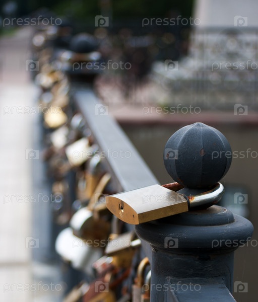 Свадебный замок на ограде набережной на открытом воздухе