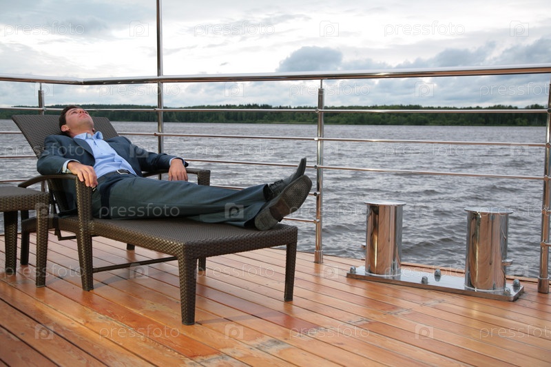 Бизнесмен лежит в шезлонге на пристани