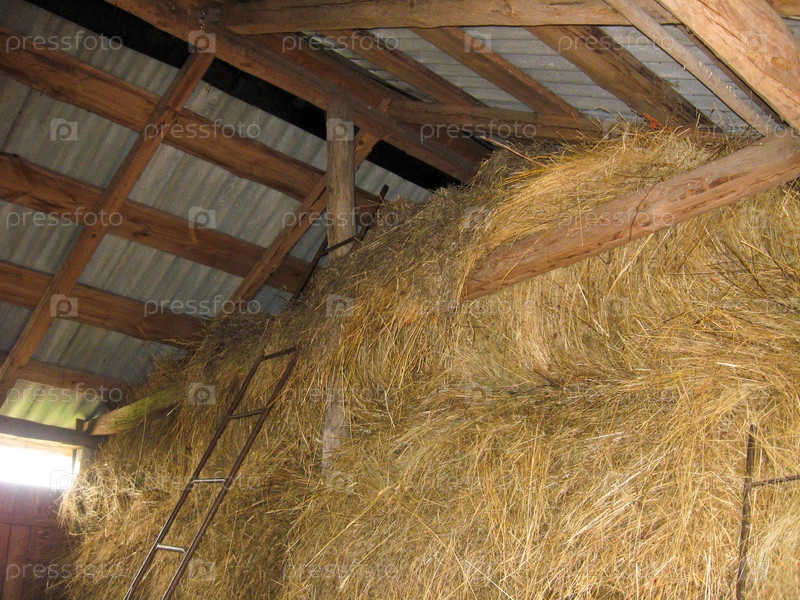 Большой сеновал с лестницей в деревне