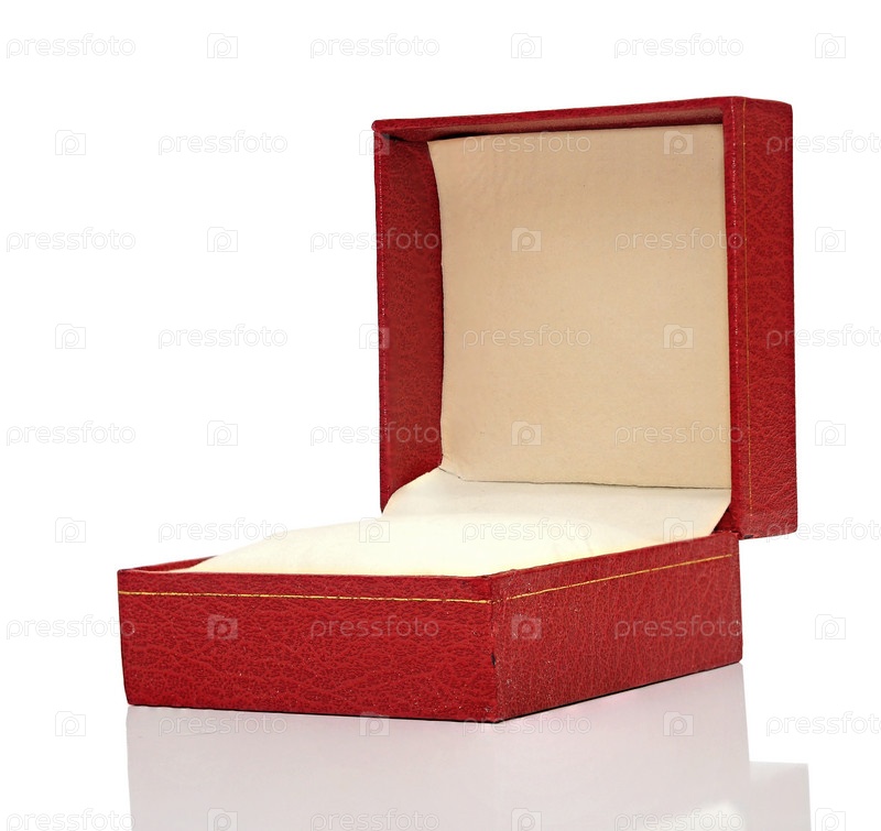 Открытая красная коробка с отражением на белом фоне
