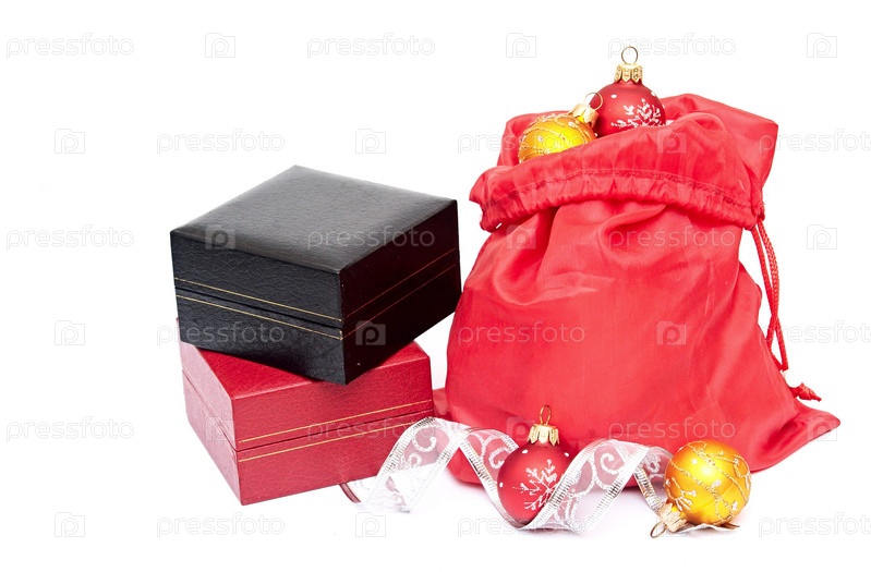 Рождественские украшения - красный новогодний шар и подарок на белом фоне