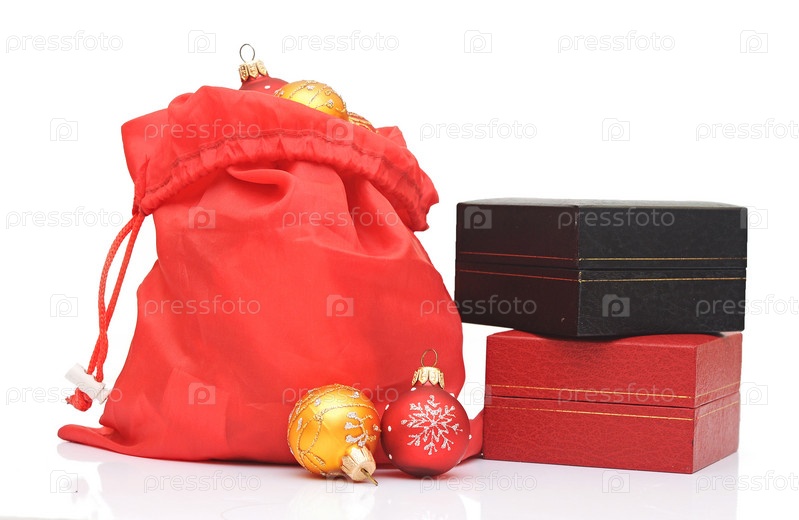 Рождественские украшения - красный новогодний шар и подарок на белом фоне