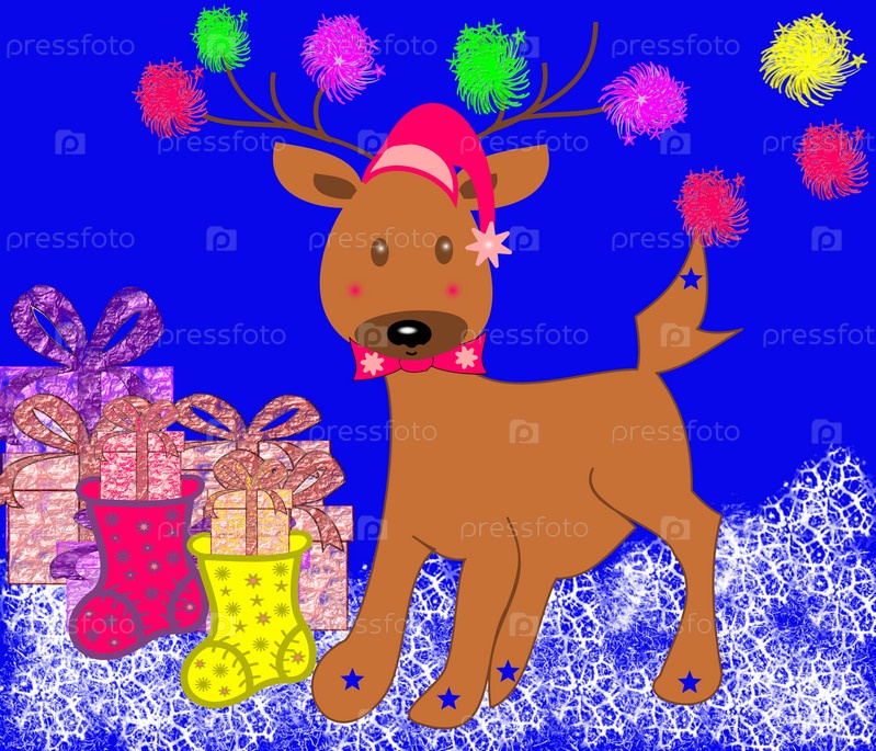 Рождественский олень с подарками и фейерверком