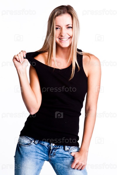 Молодая, красивая и веселая женщина в черной майке и синих джинсах