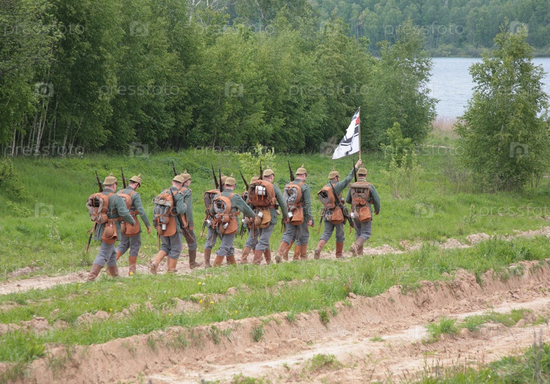 Солдаты в военном шоу о Первой мировой войне на озере Сенеж, Россия