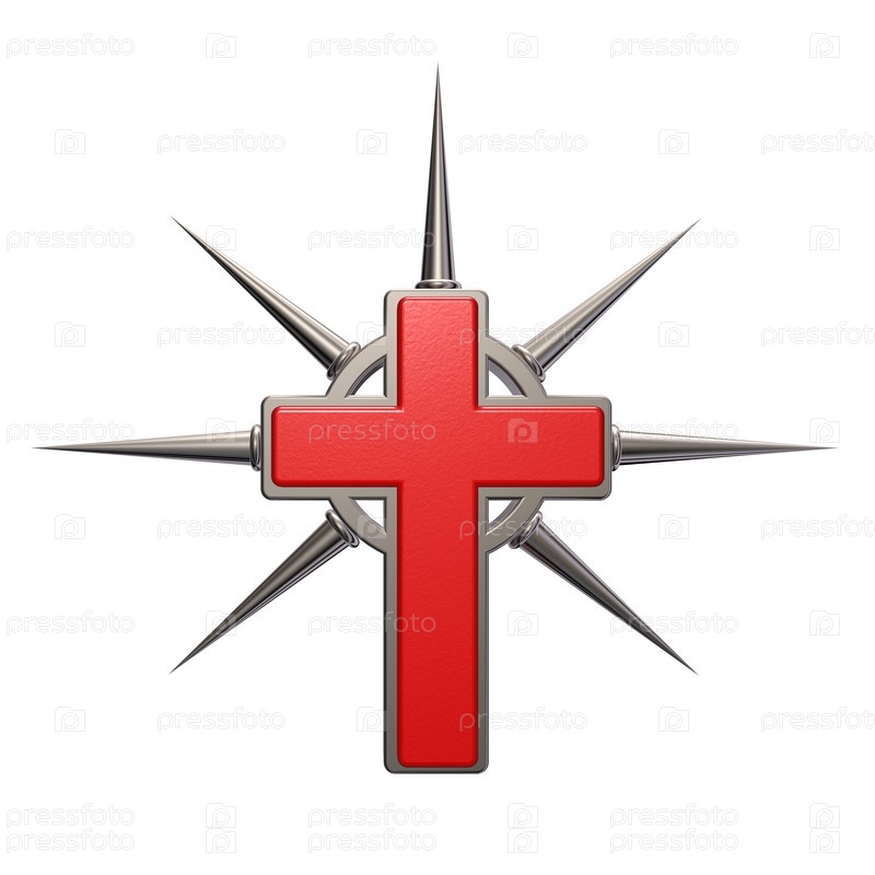 Христианский крест с металлическими шипами на белом фоне - 3d иллюстрация