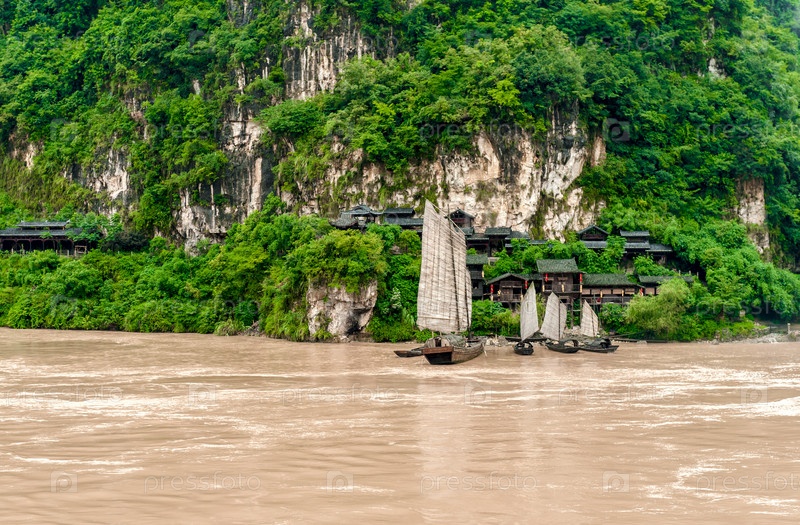 Китайская деревня и лодки на реке Янцзы в горах