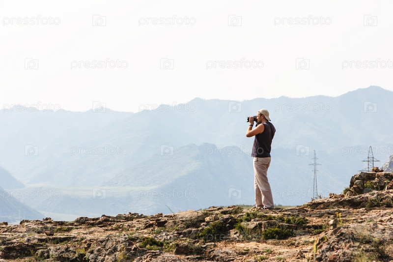 Фотограф с цифровым фотоаппаратом на вершине горы