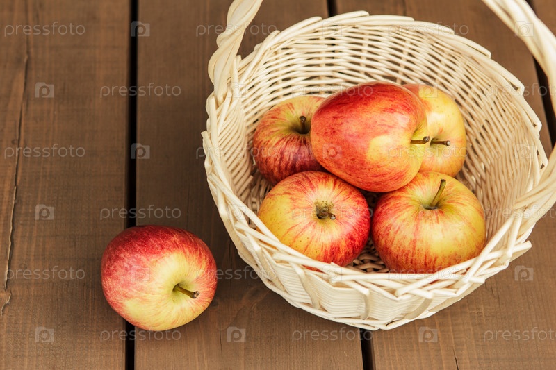Красивые и спелые яблоки в плетеной корзине