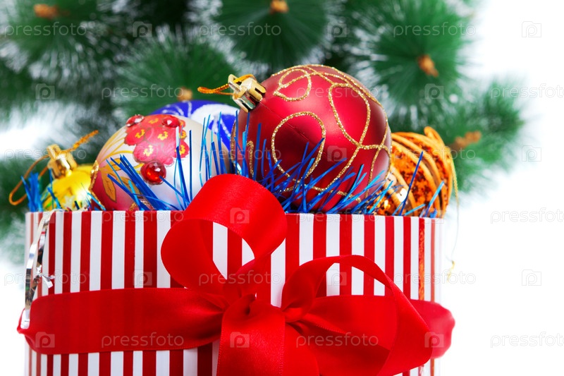 Коробка с новогодними игрушками у елки