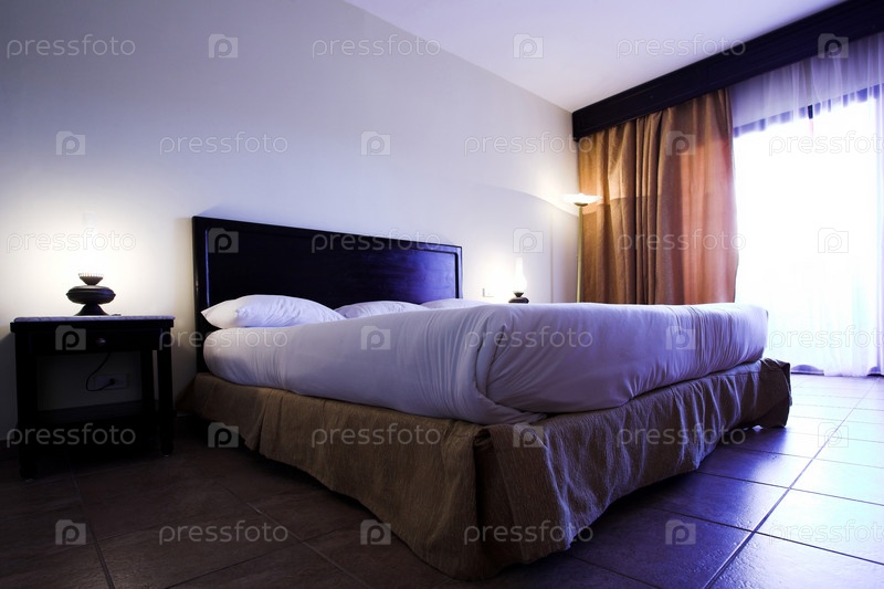 Интерьер спальни с плохими и лампами