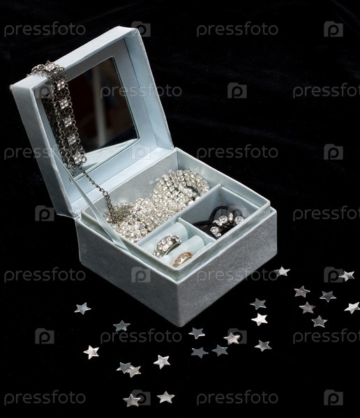 Белая шкатулка с драгоценностями на черном фоне