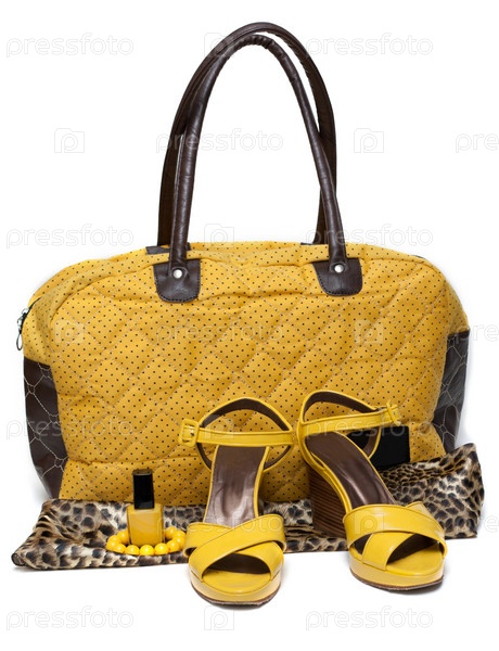 Желтая женская сумка и женские босоножки на белом фоне