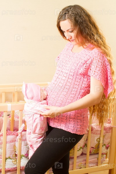 Беременная женщина с длинными волосами и игрушкой у кроватки