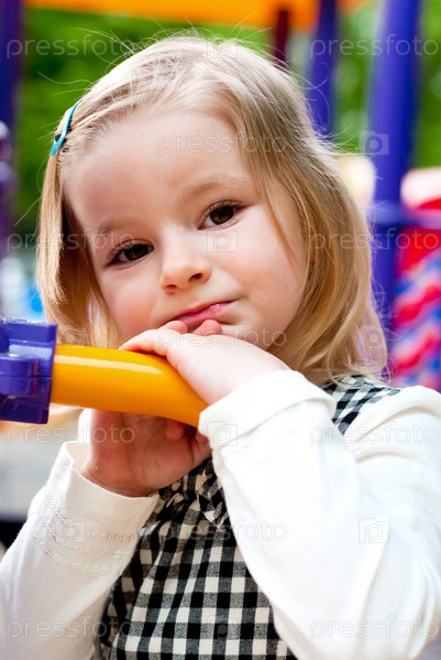 Маленькая печальная девочка на детской площадке