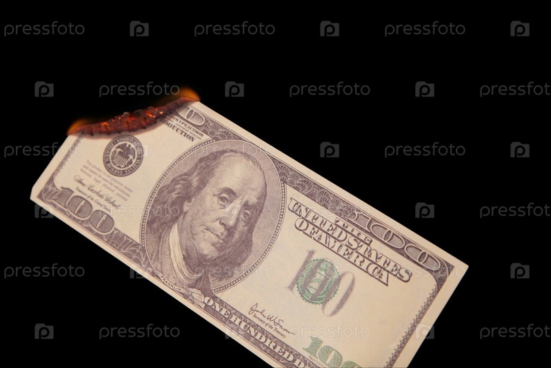 Горящая стодолларовая купюра ан черном фоне
