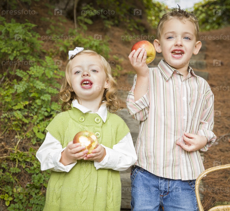 Очаровательные дети едят красные яблоки