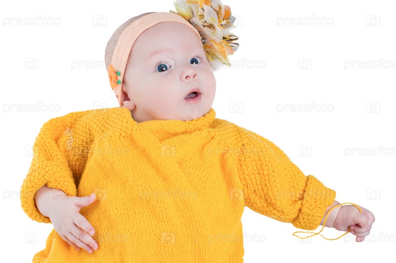 Портрет девочки с желтым цветком на голове на белом фоне
