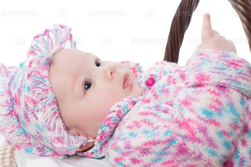 Девочка в трикотажном костюме в корзине на белом фоне
