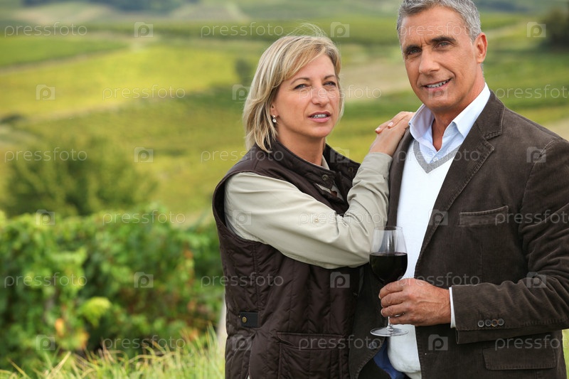 Пара с бокалом вина в винограднике