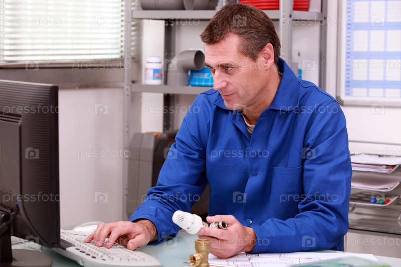 Водопроводчик проверяет детали на компьютере