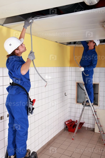 Электрики монтируют электропроводку в здании