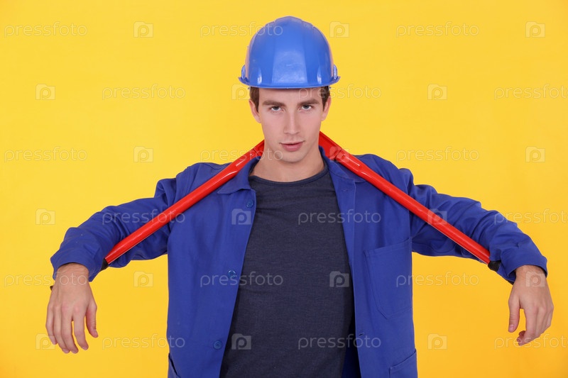 Рабочий держит огромный гаечный ключ на шее