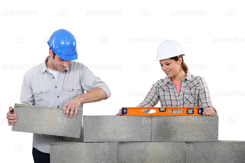 Мужчина и женщина устанавливают бетонные блоки