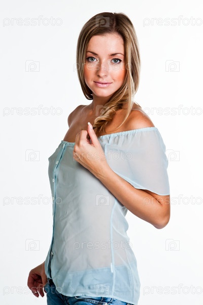 Молодая и красивая женщина блондинка в голубой прозрачной кофте