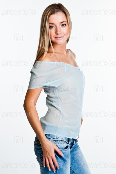 Молодая и красивая женщина блондинка в голубой прозрачной кофте
